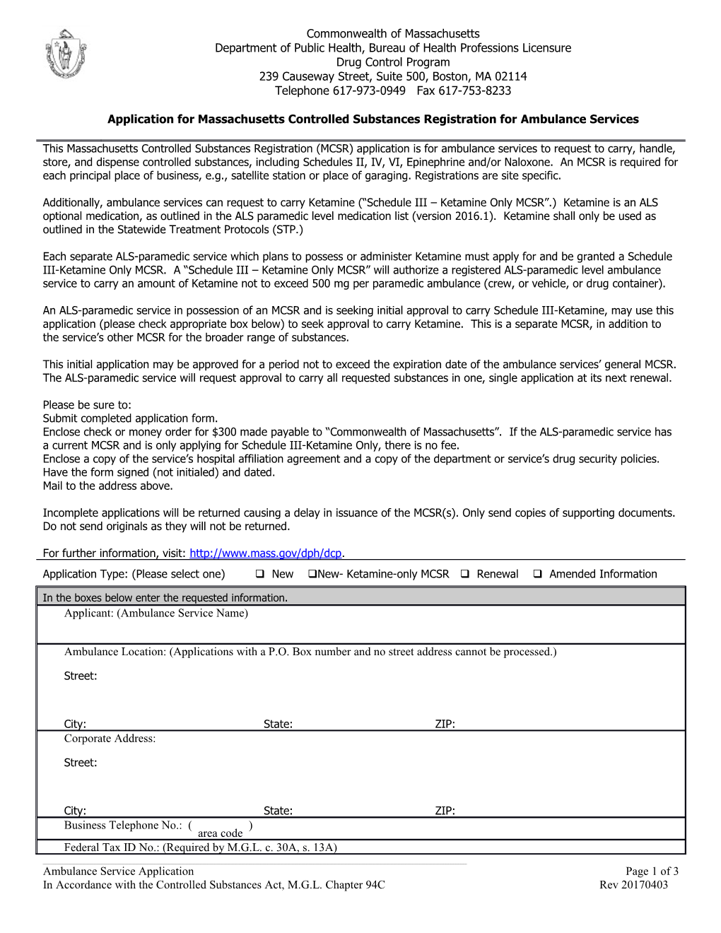 This Massachusetts Controlled Substances Registration (MCSR) application is for ambulance services to request to carry, handle, store, and dispense controlled substances, including Schedules II, IV, VI, Epinephrine and/or Naloxone. An MCSR is required for each principal place of business, e.g., satellite station or place of garaging. Registrations are site specific.